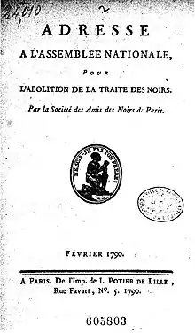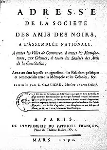 The Society of the Friends of the Blacks (Société des amis des Noirs or Amis des noirs) was a French abolitionist society founded by Jacques Pierre Brissot and Étienne Clavière and directly inspired by the Society for Effecting the Abolition of the Slave Trade founded in London in 1787.[1] The society's aim was to abolish both the institution of slavery in the France's overseas colonies and French involvement in the Atlantic slave trade.