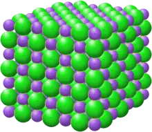 ![]() Crystal structure with sodium in purple and chloride in green[1] | |