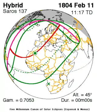 A hybrid (annular/total) solar eclipse occurred on Saturday, February 11, 1804 (Gregorian Calendar). A solar eclipse occurs when the Moon passes between Earth and the Sun, thereby totally or partly obscuring the image of the Sun for a viewer on Earth. An hybrid solar eclipse shifts between a total and annular eclipse. At certain points on the surface of Earth it appears as a total eclipse, whereas at other points it appears as annular. Hybrid eclipses are comparatively rare. This eclipse is a hybrid event, a narrow total eclipse, and beginning and ending as an annular eclipse. The greatest eclipse was in the Sahara Desert in modern-day Algeria at 26.7 N, 4.5 W at 11:16:33 UTC, in that portion it shown as a total eclipse, the remainder was as an annular.