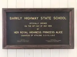 ![]() Plaque commemorating the official opening of Barkly Highway State School by Princess Alice, Countess of Athlone, on 16 May 1959 | |||||||||||||||