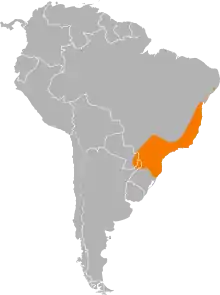 It is found in southeastern Bahia, eastern Minas Gerais, Espírito Santo, Rio de Janeiro, São Paulo, eastern Mato Grosso do Sul, Paraná, Santa Catarina, and northern Rio Grande do Sul states. It is also found in southeastern Paraguay and extreme north-east Argentina in Misiones province.[8][9]
