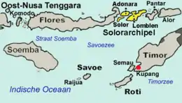 Solor is a volcanic island located off the eastern tip of Flores island in the Lesser Sunda Islands of Indonesia, in the Solor Archipelago. The island supports a small population that has been whaling for hundreds of years. They speak the languages of Adonara and Lamaholot. There are at least five volcanoes on this island which measures only 40 kilometres (25 miles) by 6 kilometres (3.7 miles). The island's area is 226.34 square kilometres (87 square miles),[1] and it had a population of 34,029 at the 2020 Census.[2] The official estimate as at mid 2022 was 35,891.[3]