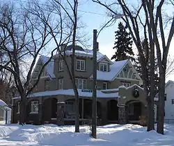 The Sommerville/Petitt House is a municipally-designated, historic building located in the Nutana neighbourhood of Saskatoon, Saskatchewan, Canada. [1] The property is a 2+12-story, stucco-and-brick house in a blended Tudor Revival and Spanish Revival style constructed in 1912.[2] Features of the building include a tower topped with a bell-cast dome, a large arched porch with porte-cochere, and a carriage entrance supported by fieldstone pillars.[3]