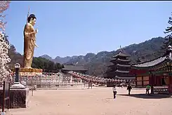 Beopjusa Temple grounds, with a golden statue of Buddha.