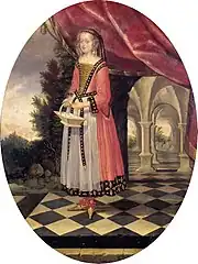 Queen Sophie Amalie is known as the hostess and central figure of the many grand representational parties that dominated Danish court life during her husband's reign. The Spanish envoy Rebolledo described her in this role at a party which was hosted in the honor of the queen's brother John Frederick at Jægersborg in 1655. After a deer hunt, where the royal couple participated similarly dressed in red and where "the queen conquered her skill to satisfy her generosity" by, as a good hostess, allowing the guests to win over her, a ball followed in which "the queen danced all night with such a smiling distance and such a majestic dignity, that she attracted the attention and appreciation of all".[1] She participated in the amateur theater and ballet at court and, in one famous occasion, performed five roles in the same ballet: as Fama, a maid, the Muse of war - "in which she danced while waving a banner to the music with such superior rhythm, that she seemed to exceed herself" - a Spanish lady and an Amazon; a performance during which the king asked the Spanish envoy Rebolledo of his opinion and was given the reply "happy is a nation with such a king, and happy is the king with such a queen."[1]