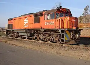 The Class 35-600 type GT18MC diesel-electric locomotive was designed by General Motors Electro-Motive Division (GM-EMD) and built in two batches for the South African Railways (SAR) by General Motors South Africa (GMSA) in Port Elizabeth. Fifty were delivered between September 1976 and May 1977, numbered in the range from 35-601 to 35-650, and another fifty between May 1977 and June 1978, numbered in the range from 35-651 to 35-700.[1][2][3][4]