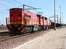 A Class 9E or Class 15E electric locomotive serves as the master of each mixed electric and diesel-electric consist, with a total of between eight and twelve locomotives per train, depending on the locomotive types involved and with twelve being the maximum number allowed. Motive power usually consists of three sets of locomotives and a lone electric locomotive pushing at the rear end of the train. Each locomotive set usually consists of one Class 9E or 15E electric and one or two Class 34 or 43-000 diesel-electric locomotives, with each set's electric locomotive controlling its respective diesel-electric companions by means of a Slimkabel (smart cable). In effect, each ore train is therefore made up of three separate 114-wagon trains consisted together, with the locomotives of all three trains and the pusher locomotive at the rear end all controlled by means of a Locotrol radio distributed power control system by one crew in the leading electric locomotive. A typical train would therefore be made up of locomotive set A, 114 wagons, locomotive set B, 114 wagons, locomotive set C, 114 wagons, and the pusher locomotive.[19][20][21]