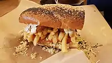 Bunny chow, a dish from Durban ("the largest 'Indian' city outside of India"[12]), consisting of a hollowed-out loaf of bread filled with curry, has been adapted into mainstream South African cuisine. In the townships surrounding Pretoria, the capital, and Johannesburg, this sandwich is often referred to as a spatlo.[13]