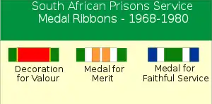 After South Africa became a republic (in 1961), the government established new decorations and medals for the various services. A series of three was instituted for the SA Prisons Service in 1968: