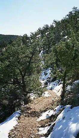 The Tonto Trail crosses the South Bass Trail a mile from the Colorado River. From this junction, to the west is Elves Chasm and the terminus of the Royal Arch Route, and to the east is the Boucher Trail and Hermit Trail, which provide access to the south rim via Hermit's Rest.