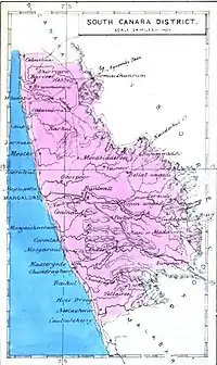 South Canara District was bordered by North Canara to north, the princely state of Mysore to east, Coorg state to southeast, Malabar District to south, and Arabian Sea to west. South Canara was one of the two districts on the western coast (Malabar coast) of Madras Presidency along with Malabar District (otherwise known as Malayalam District).[9][10][11][12]