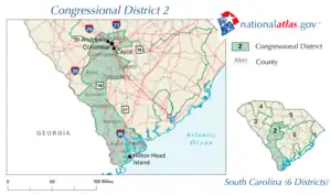 South Carolina's 2nd congressional district is in central and southwestern South Carolina. The district spans from Columbia to the South Carolina side of the Augusta, Georgia metropolitan area.