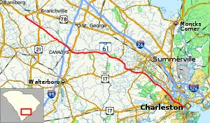South Carolina Highway 61 (SC 61) is a 67-mile-long (108 km) state highway in the U.S. state of South Carolina. The highway is designated on a north–south direction, but physically travels in an east–west direction, from SC 30 in Charleston to U.S. Route 78 (US 78) near Branchville. The portion of SC 61 from Church Creek Bridge and 10 miles (16 km) north is designated a National Scenic Byway.[2]