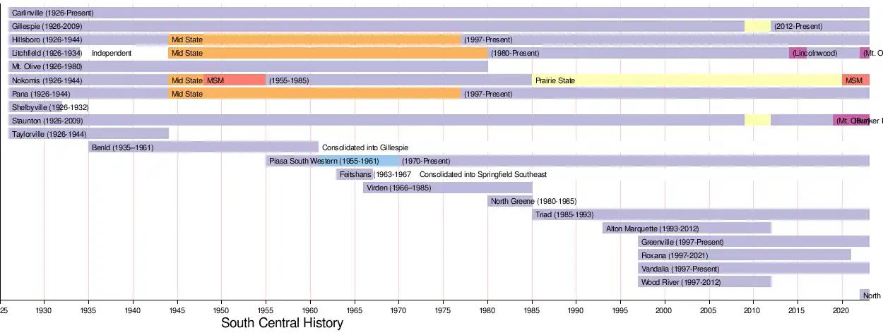 A wave of change occurred in 1944 as Hillsboro, Nokomis, Pana and Taylorville would all leave the South Central for the newly formed Mid State Conference. This exodus resulted in a 5 team football conference that would not change until 1955. Prior to the 1955 school year, Nokomis would rejoin the league as well as Piasa South Western. South Western would only remain in the conference for 6 years, leaving in 1961. That same year, Benld High School would be consolidated into Gillespie High School, reducing the number of schools back down to only 5 schools playing football. In 1963, Springfield Feitshans entered the conference and Virden High School joined in 1966. In 1967, Feitshans would close and all of attending students would go to the newly constructed Springfield Southeast High School and leave the South Central, moving to the Capitol Conference. As the 1960's came to a close, the total number of schools remained at six.[2]