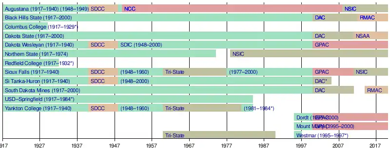(*) Augustana, Dakota Wesleyan, Huron, Sioux Falls, and Yankton played in the SDCC/SDIC from 1940 to 1948. Sioux Falls and Yankton also left in 1960 to play in the Tri-State Conference. Sioux Falls returned in 1977 and Yankton returned in 1981.