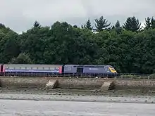 The South Devon Railway was built to the designs of Isambard Kingdom Brunel; it takes a route from Exeter which follows the River Exe to Dawlish Warren, runs beneath the sea cliffs to Teignmouth and then follows the River Teign to Newton Abbot. It follows tidal waters for about 13 miles, 4 of which are open sea.