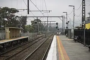 In 1972, the platforms were extended at the down end of the station.[6] In 1975, the present platform shelters were provided, when the station was modified to accommodate the quadruplication of the line to Footscray.[7] The disused station office, located near the entrance to the pedestrian underpass on Childers Street, was also provided around that time.[7] On 1 July of that year, parcel facilities at the station were abolished.[8] The following year, in November 1976, the quadruplicated line between South Kensington and Footscray was provided.[4]