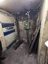 The unused westbound tunnel was used during World War I to store art from the Victoria & Albert Museum and china from Buckingham Palace and, from 1927 to 1939, was used as a signalling school. During World War II it contained equipment to detect bombs falling in the River Thames which might require the emergency floodgates on the under-river tunnels to be closed.[30]