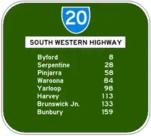 From Perth, the highway, signed as State Route 20,[1] starts from the Albany Highway junction in Armadale, 28 km from Perth, and follows a north–south route 20–30 km inland from the coast, passing through several agricultural and timber towns that sprang up in the 1890s when the nearby railway came through, such as Pinjarra, Waroona, Yarloop and Harvey.
