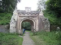 Lady Wimborne Bridge was built to carry the Southampton & Dorchester Railway over the main drive to Canford House. The railway closed 3 May 1977