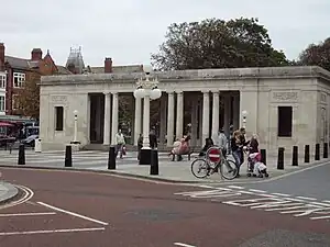 As a result of a meeting on 14 February 1919 a War Memorial Committee was established to raise money by public subscription for a monument, to extend the hospital, and to provide grants for bereaved children. The monument was to be sited in London Square as part of a scheme to remodel the centre of the town. A total of £31,854 was raised, and a competition was launched for the design of the monument. Reginald Blomfield was appointed as adviser and assessor of the competition.[lower-alpha 1] The first prize was given to the Liverpool partnership of Grayson and Barnish.[lower-alpha 2] The original designs did not specifically include any sculpture, and concern was expressed about this, leading to the appointment of Herbert Tyson Smith as sculptor. The initial tenders for building the memorial were considered to be too high, and after a second set of tenders W. Moss and Son were commissioned as main contractors. Following some delays in its construction, the memorial was unveiled on 18 November 1923 by the Earl of Derby. Following the Second World War, an additional inscription was designed by Barnish and executed by Tyson Smith; this was unveiled on 28 October 1956. At the same time fountains were installed in the Pools of Remembrance.[3] In 1992 plaques were added containing the names of those lost in the Second World War, and later the names of those who have died as a result of later conflicts have been added.[4]