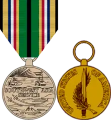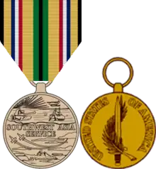 The Southwest Asia Service Medal (SASM or SWASM) is a military award of the United States Armed Forces which was created by order of President George H.W. Bush on March 12, 1991. The award is intended to recognize those military service members who performed duty as part of the Persian Gulf War and for a time thereafter. The medal was designed by Nadine Russell of the Army's Institute of Heraldry.[1][2] The colors of the ribbon are tan, representing sand, with the black, white, red, blue, and green colors symbolizing the colors of coalition countries' national flags.