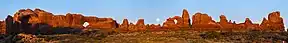 The Colorado Plateau varies from the large stands of forests in the west, including the largest stand of ponderosa pine trees in the world, to the Mesas to the east.[29] Although not called a desert, the Colorado Plateau is mostly made up of high desert. Within the Southwest U.S. region, the Colorado is bordered to the south by the Mogollon Rim and the Sonoran Desert, to the west by the Mojave Desert, and to the east by the Rocky Mountains, the Rio Grande Rift valley, and the Llano Estacado.[25] The Plateau is characterized by a series of plateaus and mesas, interspersed with canyons.[25] The most dramatic example is the Grand Canyon.[30] But that is one of many dramatic vistas included within the Plateau, which includes spectacular lava formations, "painted" deserts, sand dunes, and badlands.[31] One of the most distinctive features of the Plateau is its longevity, having come into existence at least 500 million years ago.[32] The Plateau can be divided into six sections, three of which fall into the Southwest region. Beginning with the Navajo section forming the northern boundary of the Southwestern United States, which has shallower canyons than those in the Canyonlands section just to its north; the Navajo section is bordered to the south by the Grand Canyon section, which of course is dominated by the Grand Canyon; and the southeasternmost portion of the Plateau is the Datil section, consisting of valleys, mesas, and volcanic formations.[33] Albuquerque is the most populous city often considered at the edge of this portion contained in the Southwest region, but Santa Fe, New Mexico and Flagstaff, Arizona, are also significant population centers.