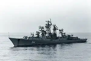 On 16 July 1987, she was temporarily transferred to the Black Sea Fleet and on 30 July delivered to the Sevastopol Marine Plant for repairs and modernization as prototype for Project 01090 prior to transfer to the Northern Fleet.[9] As the work began, the design for the modernization was changed to Project 01091. The modernization was to be completed by 30 September 1989, and differed only from the Project 01090 modernization of her sister ship Smetlivy in that she was to receive experimental nonacoustic submarine detection equipment instead of the Kaira sonar that Smetlivy was given.[14] To provide space for the equipment the aft gun turret was to be removed and the complex was to be installed at the stern helicopter pad, with two sponsons for lowering towed antennas. The modernization was 70% complete by the fall of the Soviet Union.[15]