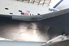 In 2003 after the breakup of Columbia during re-entry, the Columbia Accident Investigation Board conducted tests at Southwest Research Institute, which used an air cannon to shoot foam blocks of similar size, mass and speed to that which struck Columbia at a test structure which mechanically replicated the orbiter wing leading edge. They removed a section of fiberglass leading edge from Enterprise's wing to perform analysis of the material and attached it to the test structure, then shot a foam block at it.[22] While the leading edge was not broken as a result of the test, which took place on May 29, 2003, the impact was enough to permanently deform a seal and leave a thin gap 22 in (56 cm) long.[23][24][25] Since the strength of the reinforced carbon–carbon (RCC) on Columbia is "substantially weaker and less flexible" than the test section from Enterprise, this result suggested that the RCC would have been shattered.[25] A section of RCC leading edge from Discovery was tested on June 6, to determine the effects of the foam on a similarly aged leading edge, resulting in a three in (7.6 cm) crack on panel 6 and cracking on a T-shaped seal between panels 6 and 7.[26][27] On July 7, using a leading edge from Atlantis and focused on panel 8 with refined parameters stemming from the Columbia accident investigation, a second test created a ragged hole approximately 16 by 16 in (41 by 41 cm) in the RCC structure.[28][27] The tests clearly demonstrated that a foam impact of the type Columbia sustained could seriously breach the protective RCC panels on the wing leading edge.[27]