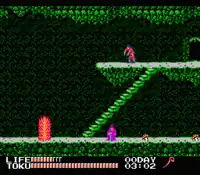 Two distinct meters keep track of the character's well-being in the game; a "life" meter helps to govern the player's stamina while a "Toku" meter helps to govern the player's morality level. Killing undead creatures improves the player's "Toku" rating. Players can choose from three character classes: explorer, clergy or esper.[6] While the explorer is basically a variation from the original Spelunker character, the Esper is an adept magic user with the ability to throw thunderbolts while the clergy member can shoot out fireballs at the enemy.[5] The number of days that have elapsed in-game in addition to the current in-game time is included and is vital for certain tasks.[7] If the player falls down a pit while having a high "Toku" rating; he is revived at a minimum cost. Suffering that same fate with a low "Toku" meter causes the player to descend to eternal damnation in Hell, thus ending the game.[8]