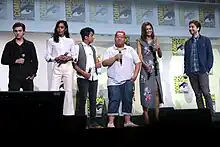 (L–R) Tom Holland, Laura Harrier, Tony Revolori, Jacob Batalon, Zendaya, and director Jon Watts promoting Spider-Man: Homecoming at the 2016 San Diego Comic-Con