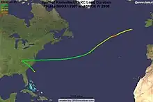 SNOX IV was the most successful flight to date, launched on March 11, 2008, it remained in the air for over 40 hours and 5,600 kilometers (3,500 mi), surpassing all flight duration and distance records for amateur balloons.[1] The ballast system used all available weight on the first night, and the balloon system succumbed to the loss of solar heat on the second sunset of its flight. The landing was just a few hundred kilometers from Ireland.