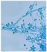 When in the environment or grown in the laboratory at 25 °C (77 °F) S. schenckii assumes its hyphal form.[5] Macroscopically, filaments are apparent and colonies are moist, leathery to velvety, and have a finely wrinkled surface. The colour is white initially and may change color over time to become cream to dark brown ("dirty candle-wax" color).[1] Microscopically, hyphae are septate approximately 1 to 2 μm in diameter. Conidia are oval shaped and glass like (hyaline) in appearance. They may be colorless or darkly colored. Conidia are sometimes referred to as resembling a flower.[6]
