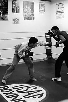 Two United States Air Force sergeants in an amateur boxing match at Kelly Air Force Base during the late twentieth century.