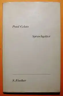 Sprachgitter is a 1959 German-language poetry collection by Paul Celan, published by S. Fischer Verlag. It was translated to English by Joachim Groschel in 1971 as Speech-Grille, and as Language Mesh by Michael Hamburger in 1988.[1]