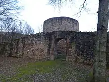 After the excavations were completed, reconstruction work was carried out, initiated by the Department of Monuments in Speyer. The outer walls and the tower were rebuilt, and a round-arched gate was inserted into the outer wall at the rear of the complex as the entrance. Some of the stones found during the excavation were used for this purpose. The modern ascent to the 8.5-metre-high tower, an iron spiral staircase, was added at that time. This leads to an observation deck, although the view from the deck through the surrounding forest is quite limited.