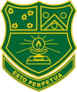 The badge, designed in 1940, has three sub-divisions in it. The first division is the Southern Cross. The second division is taken from the municipal coat-of-arms, symbolizing water and gold. The third is the lamp of knowledge, which symbolizes the striving for continuous academic excellence.[5]