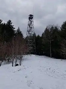 Spruce Mountain is a mountain in the Kayaderosseras Range in the town of Corinth in Saratoga County, New York. The 2,005 foot (611 m) summit is accessible via a 1.3-mile (2.1 km) trail and is topped with a 73 foot (22 m) fire tower affording a more than 120-mile (190 km) panoramic view from the Adirondacks to the Catskills, and east to Vermont. The tower, built in 1928 and refurbished in 2015, is one of only 23 remaining in the Adirondack Mountains.[2]