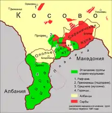 Ethnic groups in the Šar Mountain region, Kosovo, 1981 census (in Russian). Green—Muslims, Yellow—Albanians, Red—Serbs.