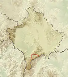 The region, an oval basin, lies below the Šar Mountains, at the source, upper stream of the Prizren Bistrica.[1] South of the region between the Prizren mountains and Koritnik mountain, lies the Gora region. It currently includes Sredska, Pousko, Jablanica, Lokvica, Rečane, Živinjane, Planjane, Nebregošte, Manastirica, Stružje, Donje Ljubinje, Gornje Ljubinje, Drajčići, Mušnikovo, Gornje Selo.