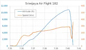 Before the autopilot was disconnected, it had been preventing the aircraft from overbanking to the left. As it was disconnected, the crew lost any protection from the autopilot. With Captain Afwan's left turn input, the aircraft banked through its maximum allowable bank angle and rolled through 90 degrees to the left. The nose then dropped and the aircraft rapidly descended towards the Java Sea below, inverted. First Officer Mamahit shouted to Captain Afwan regarding the bank angle, warning him that the aircraft had just entered an upset condition. Realizing his mistake, Captain Afwan pulled the yoke back and attempted to recover from the dive. Due to being inverted, the aircraft descended faster and his action led to an increased rate of descent.[9]:32–39 Flightradar24 reported that four minutes after takeoff, the aircraft dropped by 10,000 ft (3,000 m) in less than a minute.[17] According to AirNav Radarbox flight data, the aircraft reported that the climb phase of the flight was interrupted by a rapid drop in altitude from 10,900 to 7,650 feet (3,320 to 2,330 m) at 07:40 UTC.[18][19][20][21]