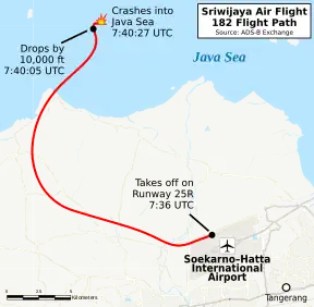 Flight 182 was scheduled to depart from Soekarno–Hatta International Airport at 13:40 WIB (06:40 UTC), and to arrive at Supadio International Airport in Pontianak, West Kalimantan, at 15:00 WIB (08:00 UTC).[10] Departure was delayed by monsoon rains, and Flight 182 took off from runway 25R at 14:36 local time (07:36 UTC).[11][12][13] Due to the delay, it was expected to land in Pontianak at 15:50 WIB (08:50 UTC).[11]