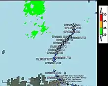 Weather data retrieved from the Meteorology, Climatology, and Geophysical Agency (BMKG) confirmed the presence of moderate to heavy rain during takeoff with chance of thunderstorms reported. The data later showed that a 15 km (9.3 mi) high cumulonimbus cloud was present around Soekarno-Hatta International Airport with the minimum temperature of the cloud tops at −70 °C (−94 °F), prompting speculation that the aircraft had encountered turbulence. Visibility was reported to be 2 km (1.2 mi).[81] Analysis by the Indonesian National Institute of Aeronautics and Space (LAPAN) showed that weather conditions were not extreme. LAPAN stated that a meso-convective system had been formed near the Java Sea at 11:00 WIB (04:00 UTC), but the system had already dissipated by the time Flight 182 took off.[82] According to NTSC, there was no indication that there would be any significant cloud on the aircraft's flight route. NTSC confirmed, however, that the pilots had contacted Jakarta ATC to change its heading to 075 degrees due to bad weather.[28]