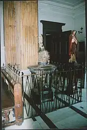 The organ, by Charles Allen, is contemporary with the chapel, and is on a high west gallery, under the barrel vault. English classical organ Despite the small specification, the organ is laid out grandly and occupies a big mahogany case with a gilded front (the facade starts at 8' C – the four lowest Open Diapason pipes are inside). The Great Organ is in the obvious place at impost level, and the tiny swell-box is above and behind, with the Pedal Pipes on either side below it. The entire base of the organ is occupied by an enormous double-rise reservoir, about twelve feet by six.