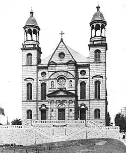 The parish was canonically established in 1849 as the Bronx began attracting German and Irish residents. The first mass was held in a private residence on Boston Road.[8] The Morrisania site for the present church on the northeast corner of Franklin Avenue and Jefferson Street was purchased in 1850 with a small wooden church immediately being erected. This in turn was replaced in 1858 by one of brick construction and dedicated by Archbishop John Hughes.[6] In 1892, the parish address was at 867 Jefferson Street.[9] That structure was destroyed in 1894 during a fire and the present structure was dedicated in 1895.[6]