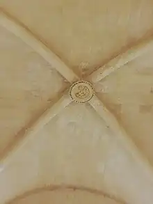 According to a number of inscriptions, the bosses of the arches' intersections in the rib-groins were erected in 1593 and 1603 respectively. With the addition of the transept, this was the first church in Malta to be given the form of a latin cross.[23] With the crossing of the main axis of the enlarged church, and the construction of a new transept, a dome was probably erected in 1606, the date in the dome inscription. The dome is low and saucer-like in shape, and is probably one of the earliest examples still in existence in Malta.[21]