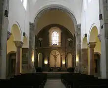 St Georg's has the trefoil-shaped eastern end typical of other Romanesque churches of Cologne, its chancel and transepts each terminating in an apse. The nave is unique in Cologne in having its arcade supported on columns rather than piers.[1]