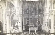 A brick rectory lies next to the church's eastern side. Built in 1901, it combines a range of architectural styles into an elaborate house. Located behind the rectory are a catechetical center and a public elementary school.[6] An older parochial school was once located on the church's western side; built in the Italianate style in 1905, it served as a public junior high school after the church discontinued its use.[2]