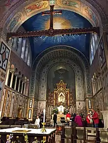 The church's walls are made of reinforced concrete two and a half feet thick clear to the roof, and the structure is 69 feet from floor to ceiling.[11] The wood-beamed ceiling is a reproduction of a church ceiling from the 11th century at San Miniato, near Florence.[11] The altar is made of Italian marble, and the triptych was carved by Oberammergau workmen.[11] The interior includes a stained glass window featuring Martin Luther King Jr., installed in 1977. Other windows include a Romanesque rose window. Another striking feature of the church is found in the gold mosaics on the chapel walls. One mosaic depicts the Virgin Mary and Christ child modeled after a 13th-century mosaic at the Cathedral of Santa Maria Assunta in Torcello, Italy. There is also a mosaic of Jesus as judge, holding a Bible and giving a blessing, a 12th-century convention.[8]