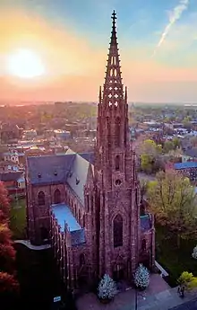 The historic Gothic Revival third church is located at 35 Edward Street. The church is laid out in a Latin-cross floor plan and features a 245 ft octagonal Medina sandstone steeple with a Seth Thomas clock. Above the steeple rests a 72 ft pierced spire; reputed to be the tallest open-work spire ever built completely of stone (without reinforcement) in USA.[1]